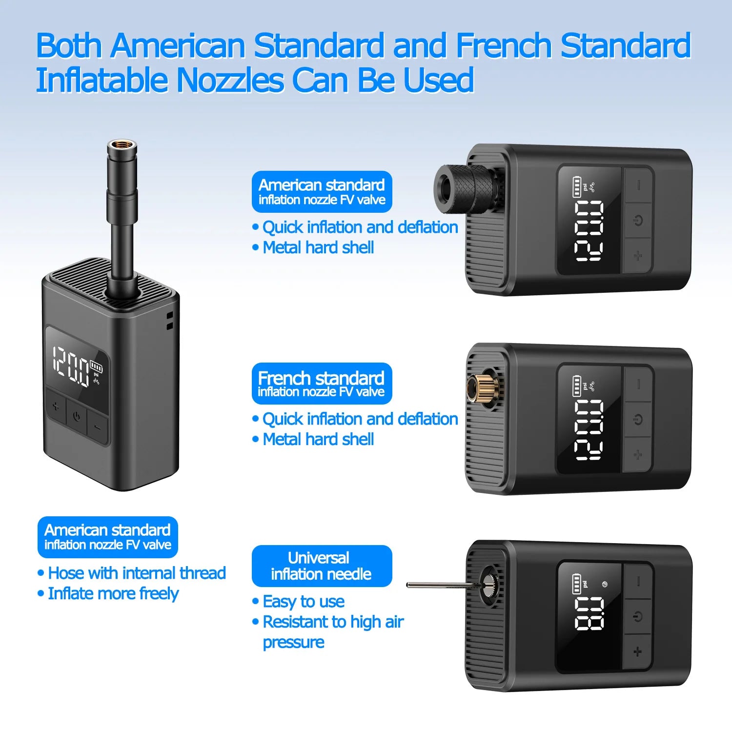 Inteligente y preciso: la pantalla digital incorporada garantiza un inflado preciso de neumáticos, pelotas y otros inflables.